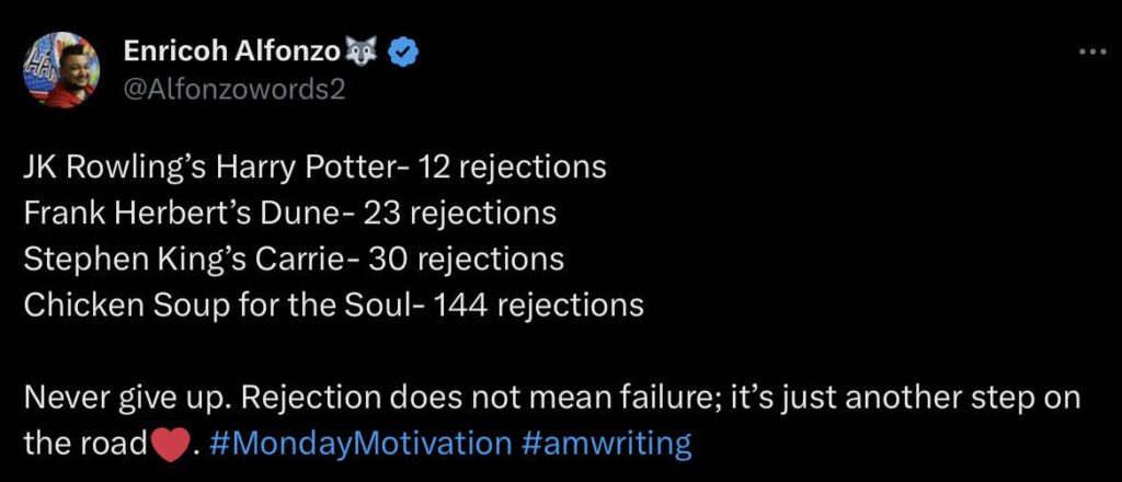 So, for the next little while, I’ll be putting my story “out there” for agents to consider. It’ll be a long and frustrating process, I’m sure, but a necessary step if I’m ever going to achieve the goal of being published. In the meantime, I’ll need to remember what the chances of success are: